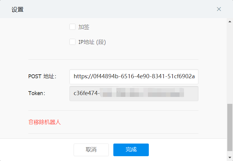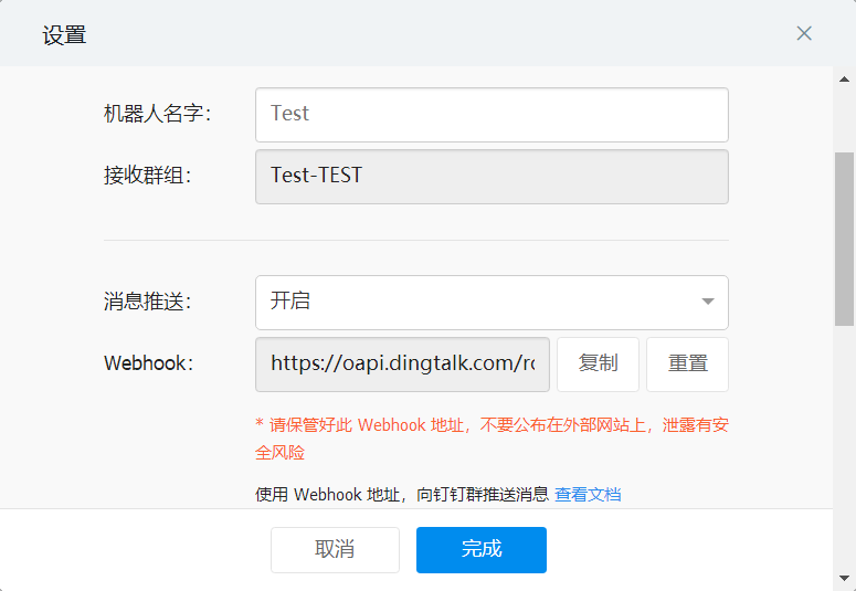 @机器人 触发回话在机器人设置里,开启消息推送,复制 Webhook 备用,在下方 安全设置 中需要设置其中一项,比如设置自定义关键词,之后可以提供关键词触发机器人对话。