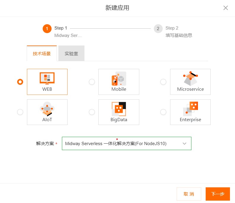 登入云开发平台,进入到应用列表,点击 创建新应用,新建一个 WEB 场景的 Midway Serverless 一体化解决方案 (For NodeJS10)。