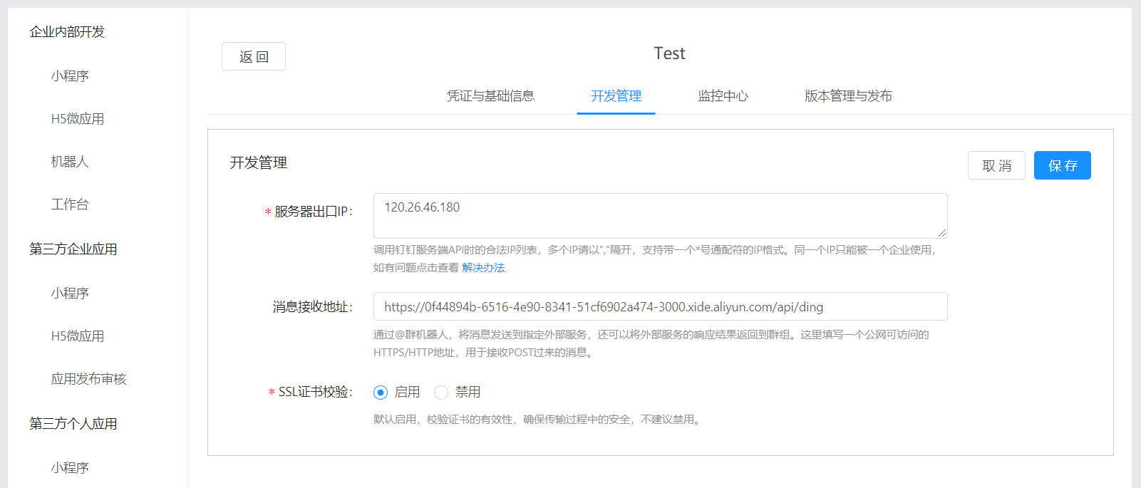 将完整带有 /api/ding 的链接复制到钉钉开放平台上,具体位置为机器人管理的 开发管理。