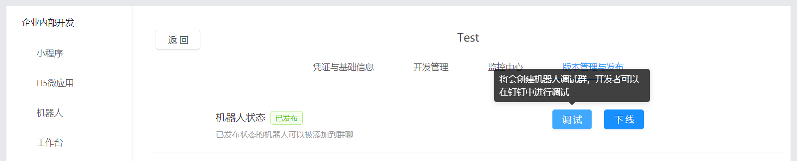 进入机器人的管理页面,点击 版本管理与发布,用手机钉钉扫描 调试 的二维码进调试群,并上线机器人。