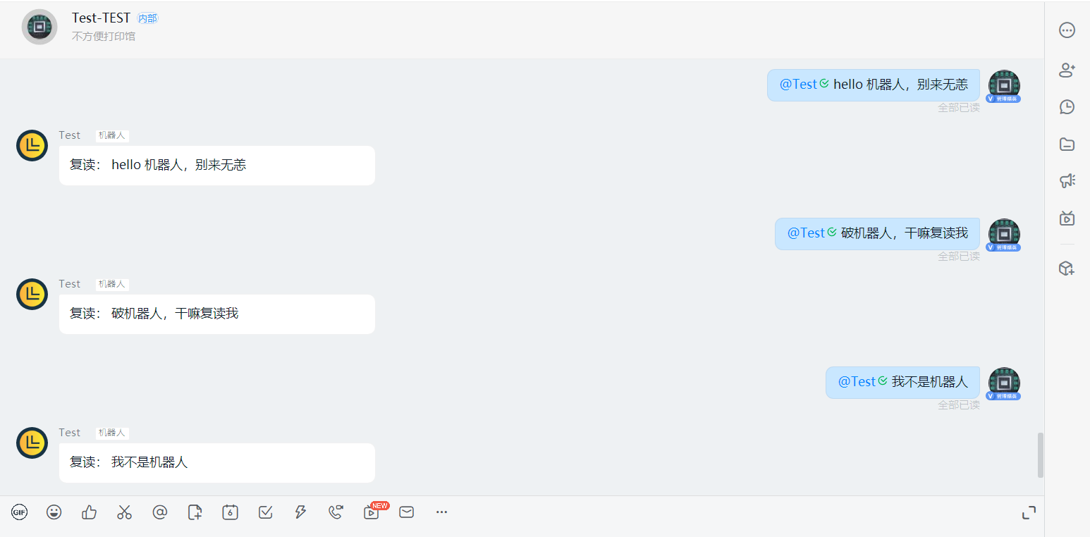 至此,回到钉钉群发送 @机器人的名字 + 消息,可以看到机器人回话并返回发送的消息。