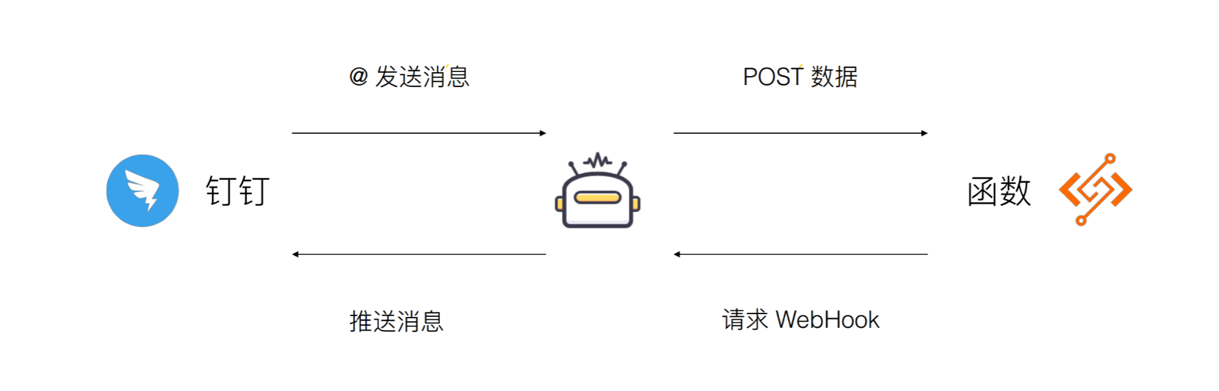钉钉群机器人之所以能回话,主要是函数和 Webhook 的作用。