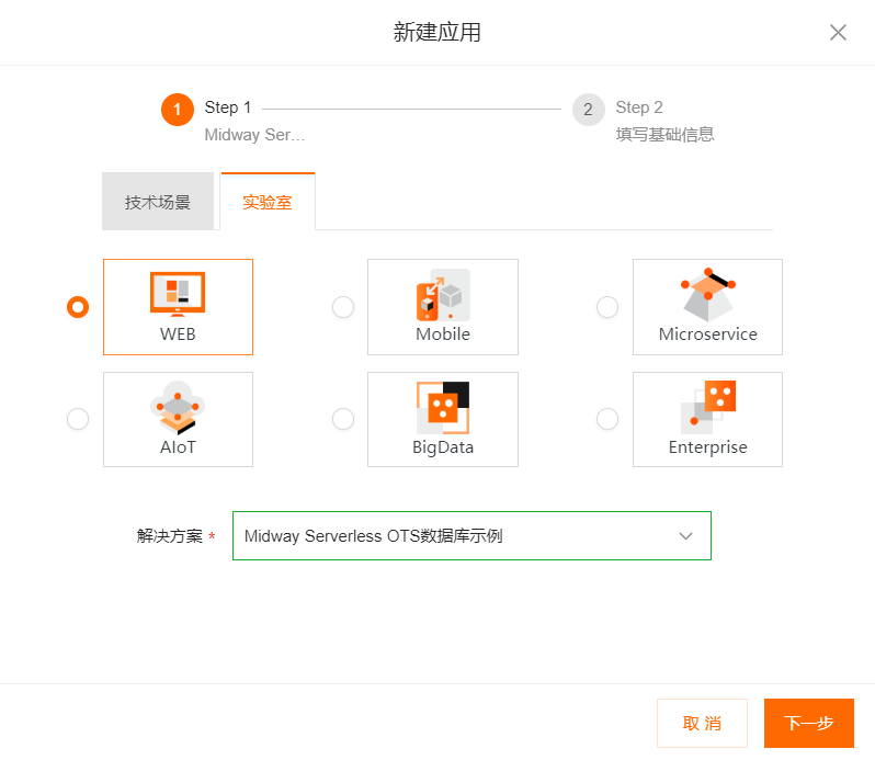 登入云开发平台,进入到应用列表,点击 创建新应用,新建一个 WEB 实验室解决方案的 Midway Serverless OTS数据库示例。