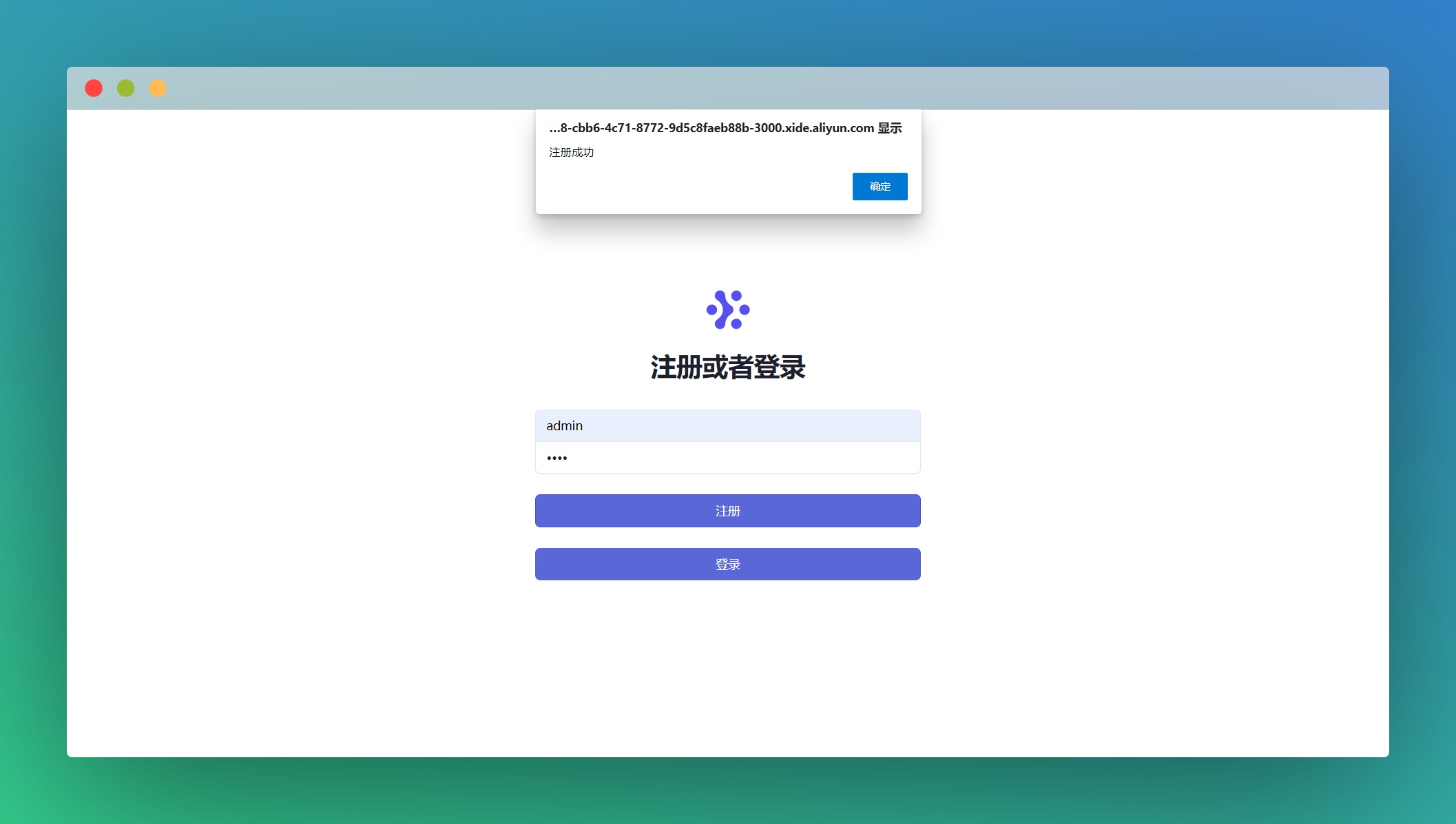 尝试注册一个新账号,注册成功时会弹窗提示: