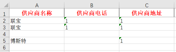 录入 Excel 模板,包含三条有效数据和一行空行,其中第三行与第二行重复,第五行缺了“供应商电话”。