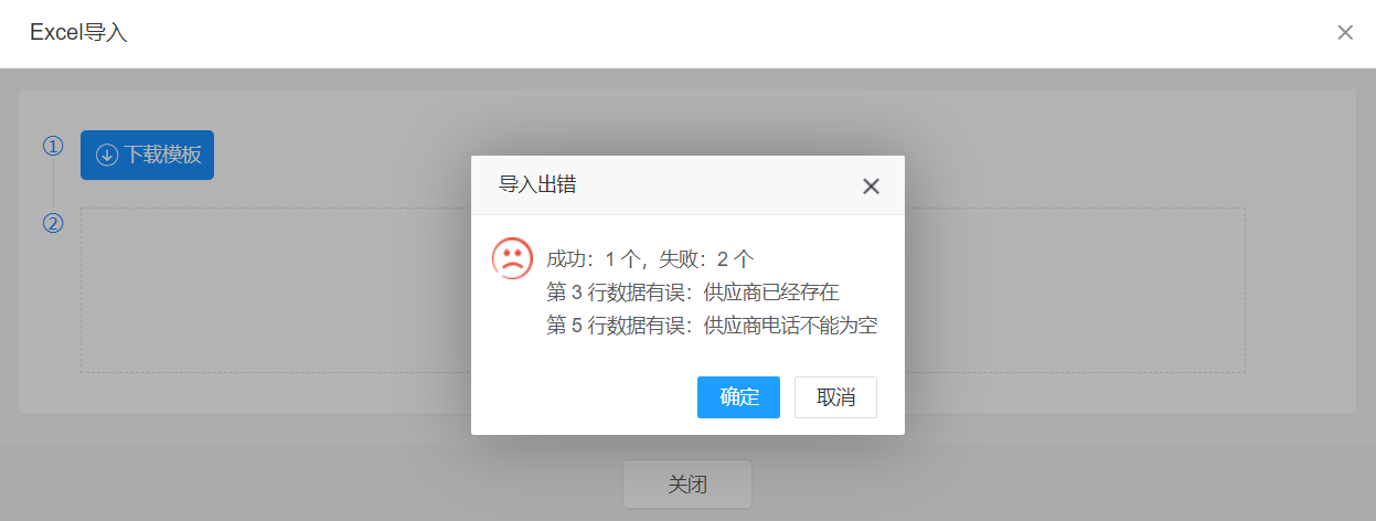 上传完成后,返回导入结果,具体显示了成功数、失败数和出错原因。如果不存在错误,上传完成后将自动返回表格并刷新数据。
